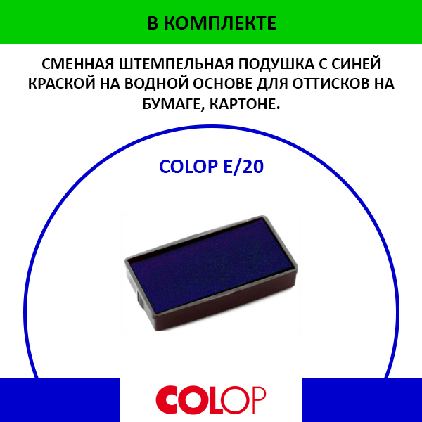 Штемпельная подушка Colop E/20: сменная, синяя, в комплекте. Краска на водной основе с содержанием глицерина.